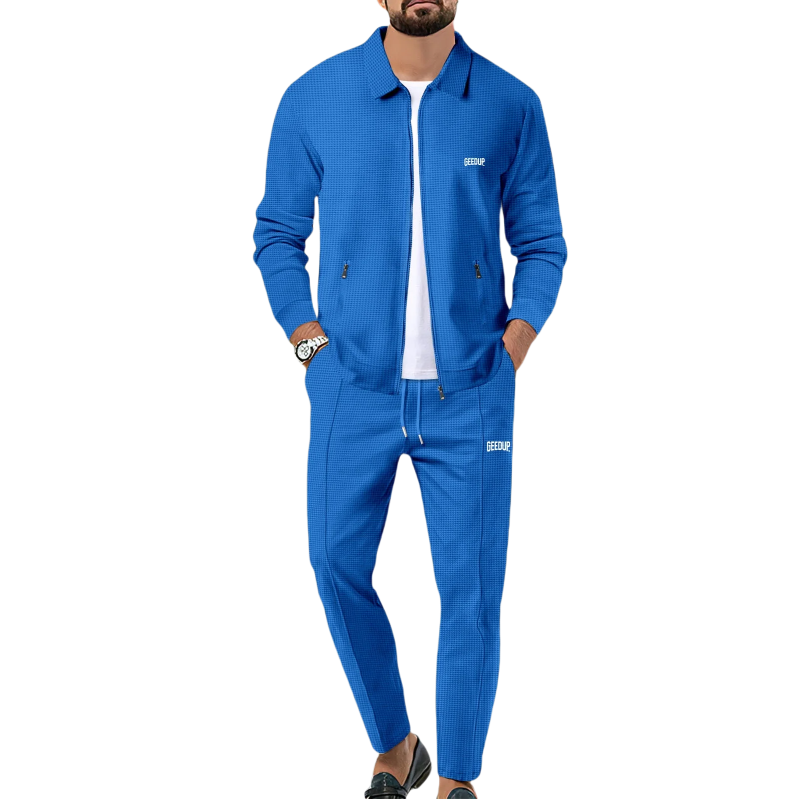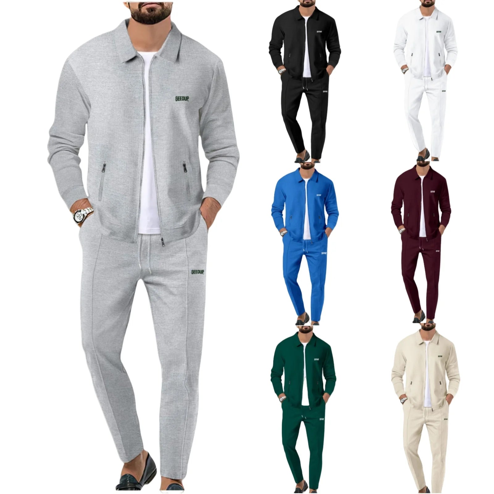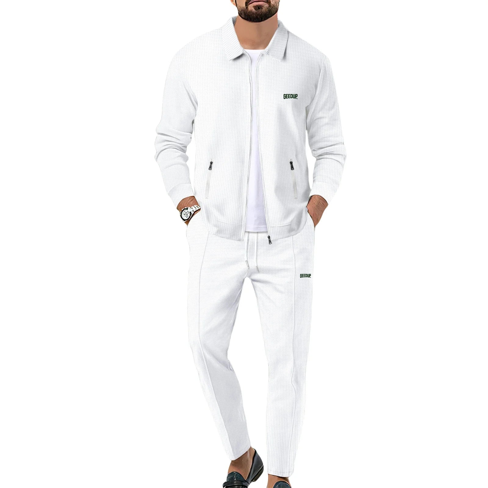 Men's casual sports suit, youth spring and autumn Waffle zipper pocket lapel slim fashion long sleeve cardigan, men's jacket set