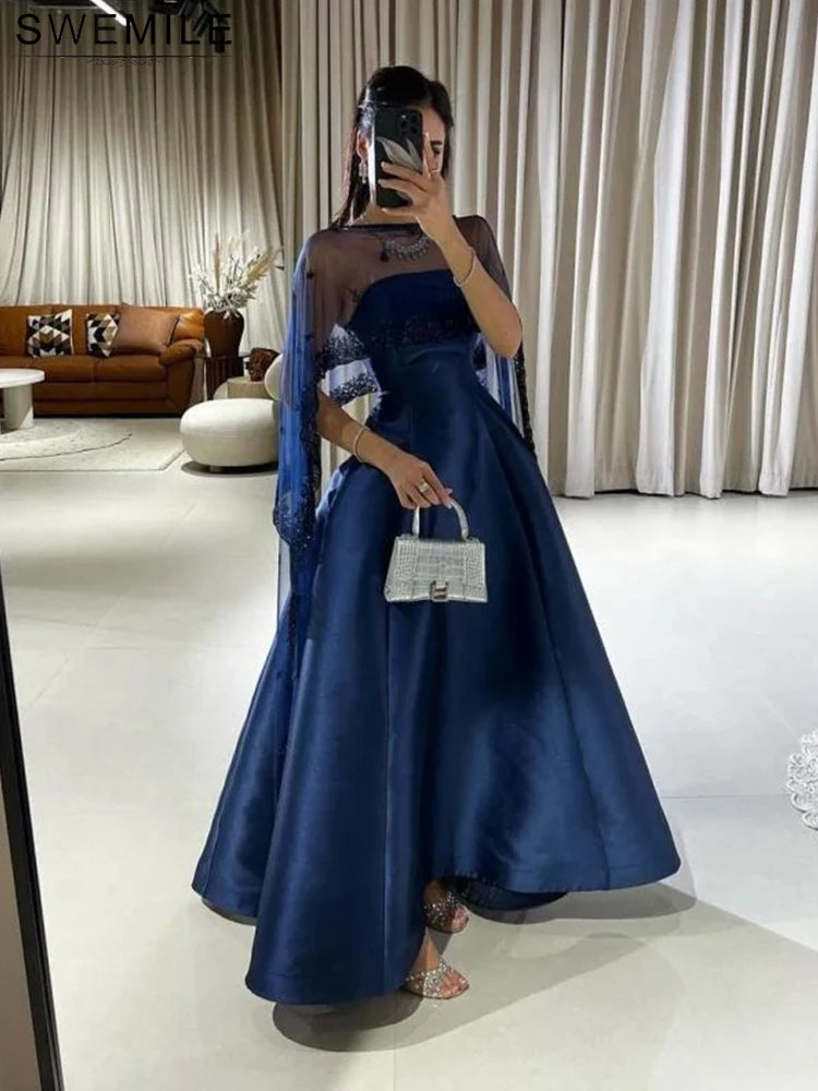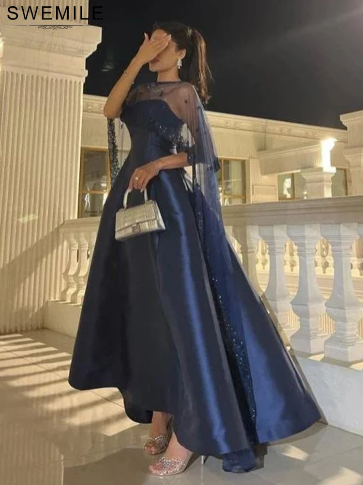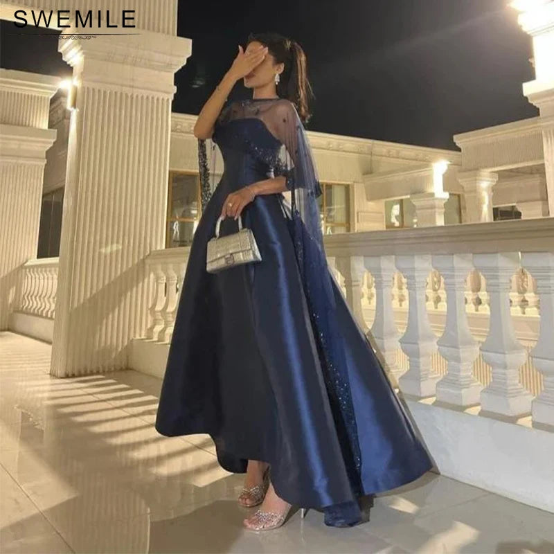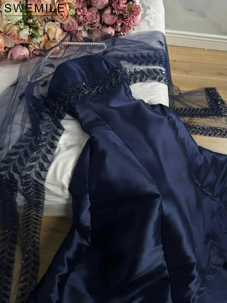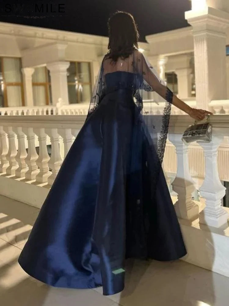 SWEMILE Elegant Sequined Appliques Lace Evening Dresses With Tulle Shawl Pleat Satin A-Line Strapless Prom Gowns Sweep Train